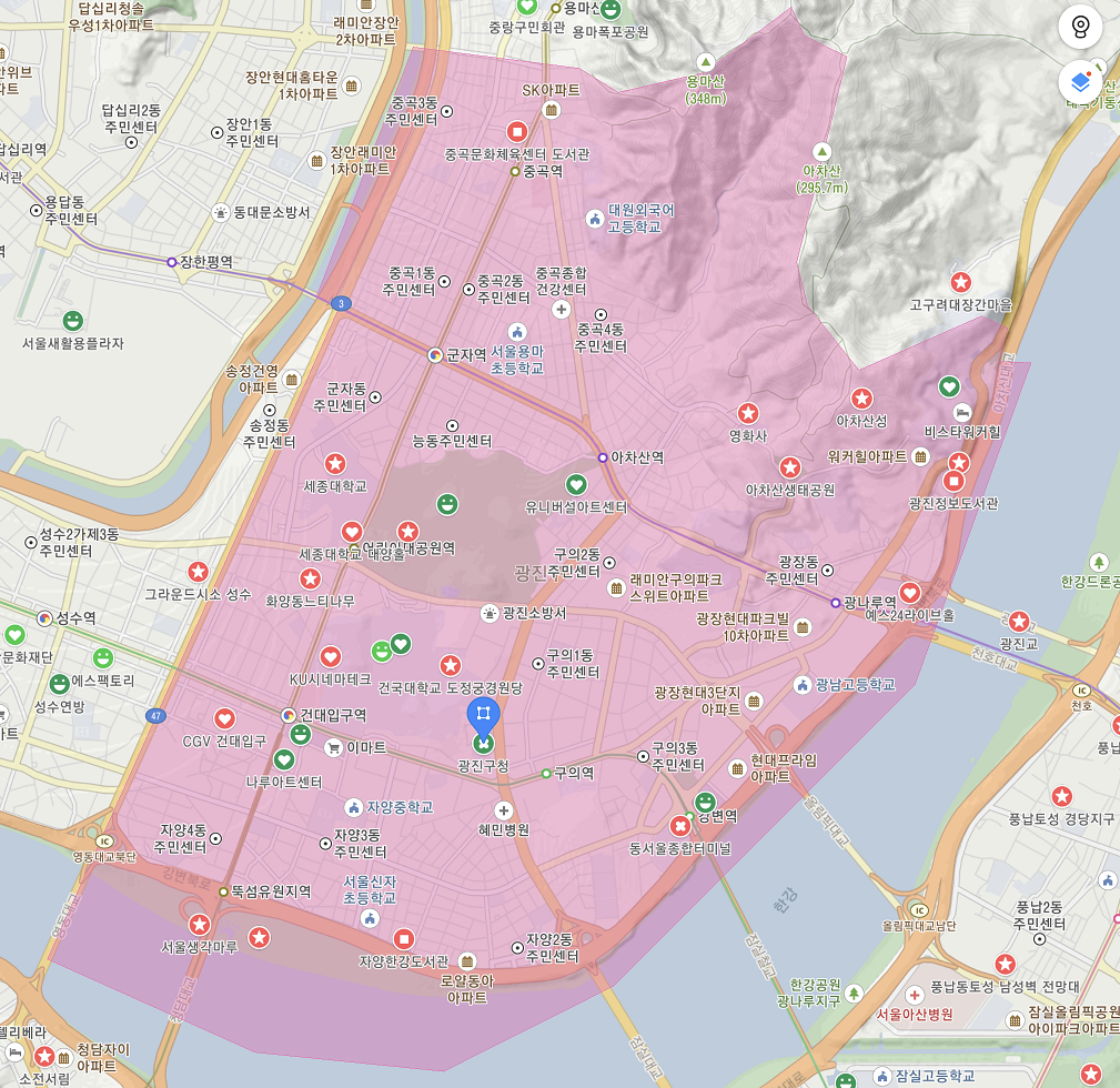 - 광장동, 구의동, 군자동, 능동, 자양동, 중곡동, 화양동
