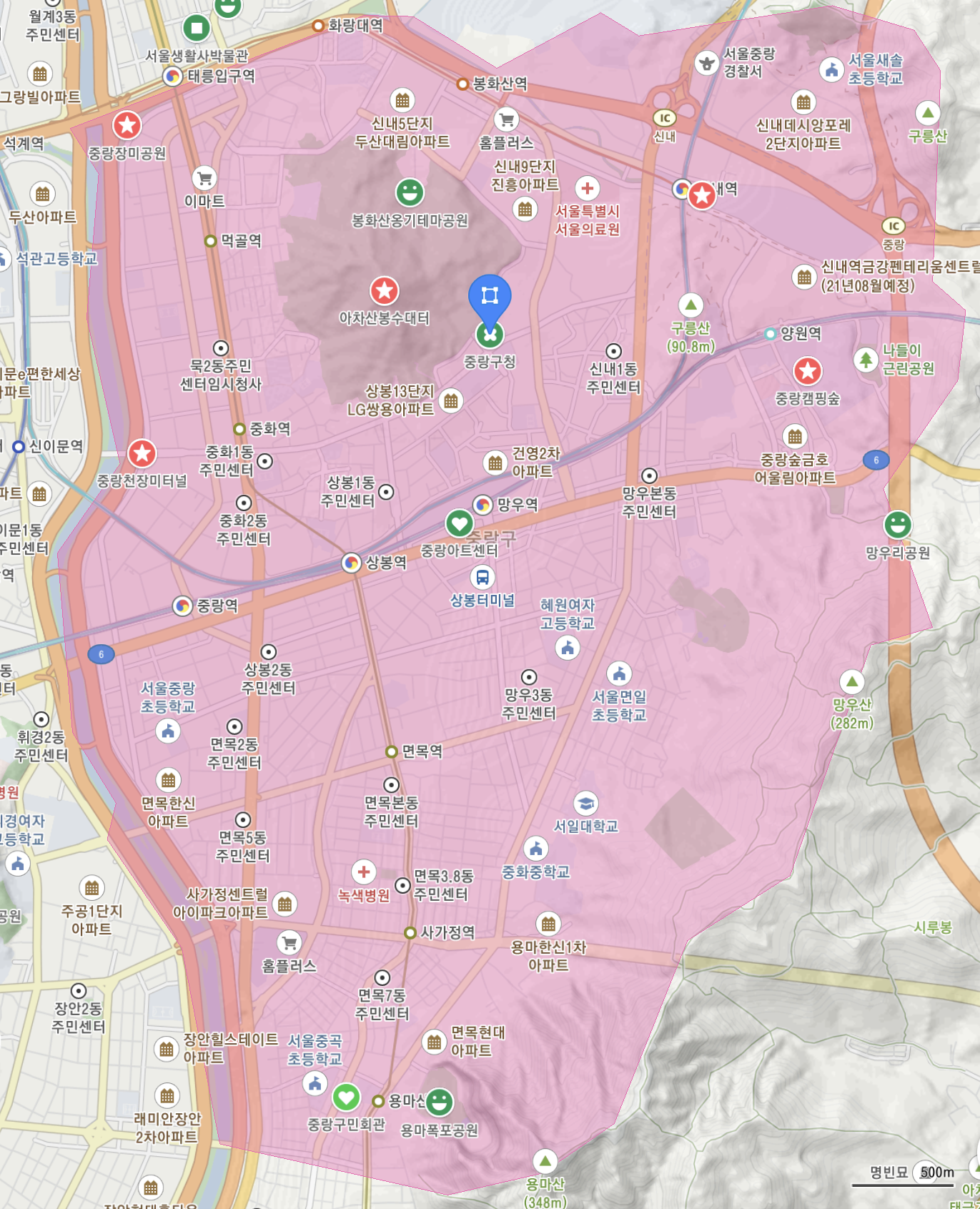 중랑구청은 중앙에서 약간 북쪽에 위치.