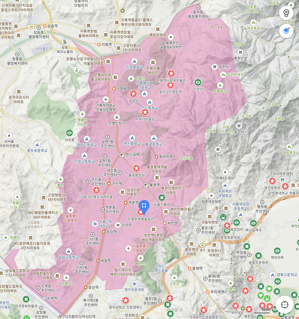 노원구, 도봉구, 강북구, 성북구들도 다 산이 많이 차지하는 지형이지만, 은평구는 더욱 자연이 강조된 듯.