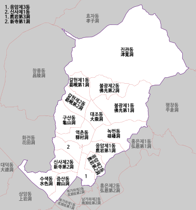 11개 법정동(녹번동, 불광동, 갈현동, 구산동, 대조동, 응암동, 역촌동, 신사동, 증산동, 수색동, 진관동)과 16개 행정동으로 구성.