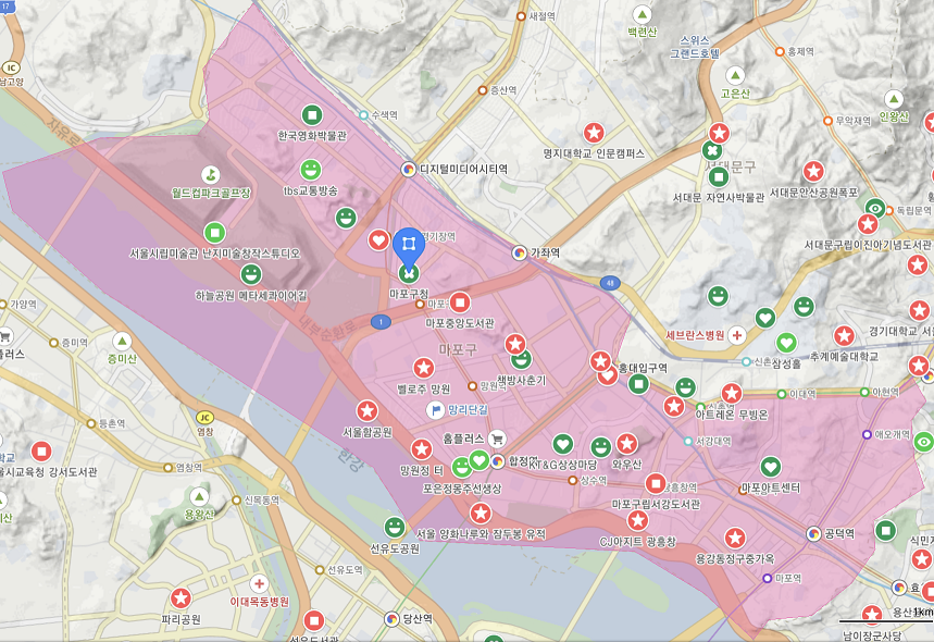 중구, 용산구,서대문구,은평구, 그리고 강을 경계로 강서구, 영등포구, 서쪽으로는 경기도 고양시와 접하고 있다.