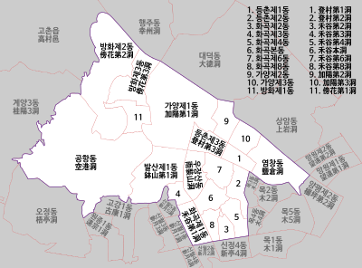 (법정동 - 개화동, 과해동, 오곡동, 오쇠동, 방화동, 공항동, 마곡동, 외발산동, 내발산동, 가양동, 등촌동, 화곡동, 염창동)