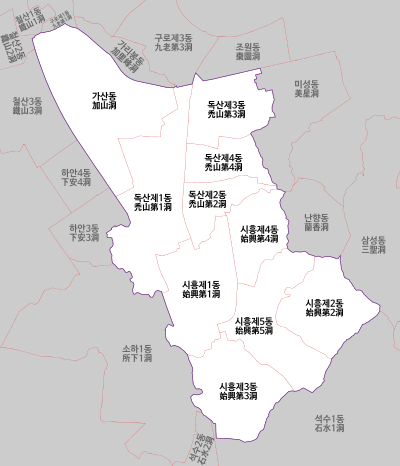 10개의 행정동과 3개의 법정동으로 구성 - 가산동, 독산동, 시흥동