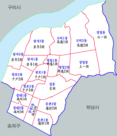 - 강일동, 상일동, 고덕동, 길동, 둔촌동, 명일동, 성내동, 암사동, 천호동
